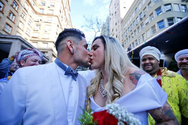 Uma história de amor envolvendo uma mulher trans e um homem cis teve um desfecho inspirador e romântico em Porto Alegre. Bruna Belém da Barra se casou com Patrick Souza na tarde da última quinta-feira (17) em plena Esquina Democrática, no centro da cidade, e atraiu centenas de pessoas.